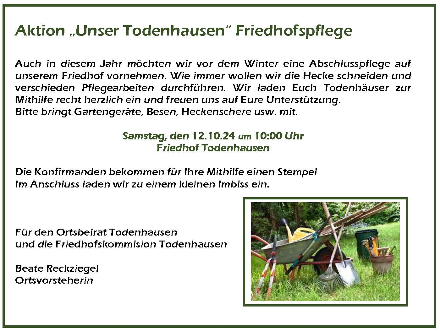 Auch in diesem Jahr möchten wir vor dem Winter eine Abschlusspflege auf unserem Friedhof vornehmen. Wie immer wollen wir die Hecke schneiden und verschieden Pflegearbeiten durchführen. Wir laden Euch Todenhäuser zur Mithilfe recht herzlich ein und freuen uns auf Eure Unterstützung.